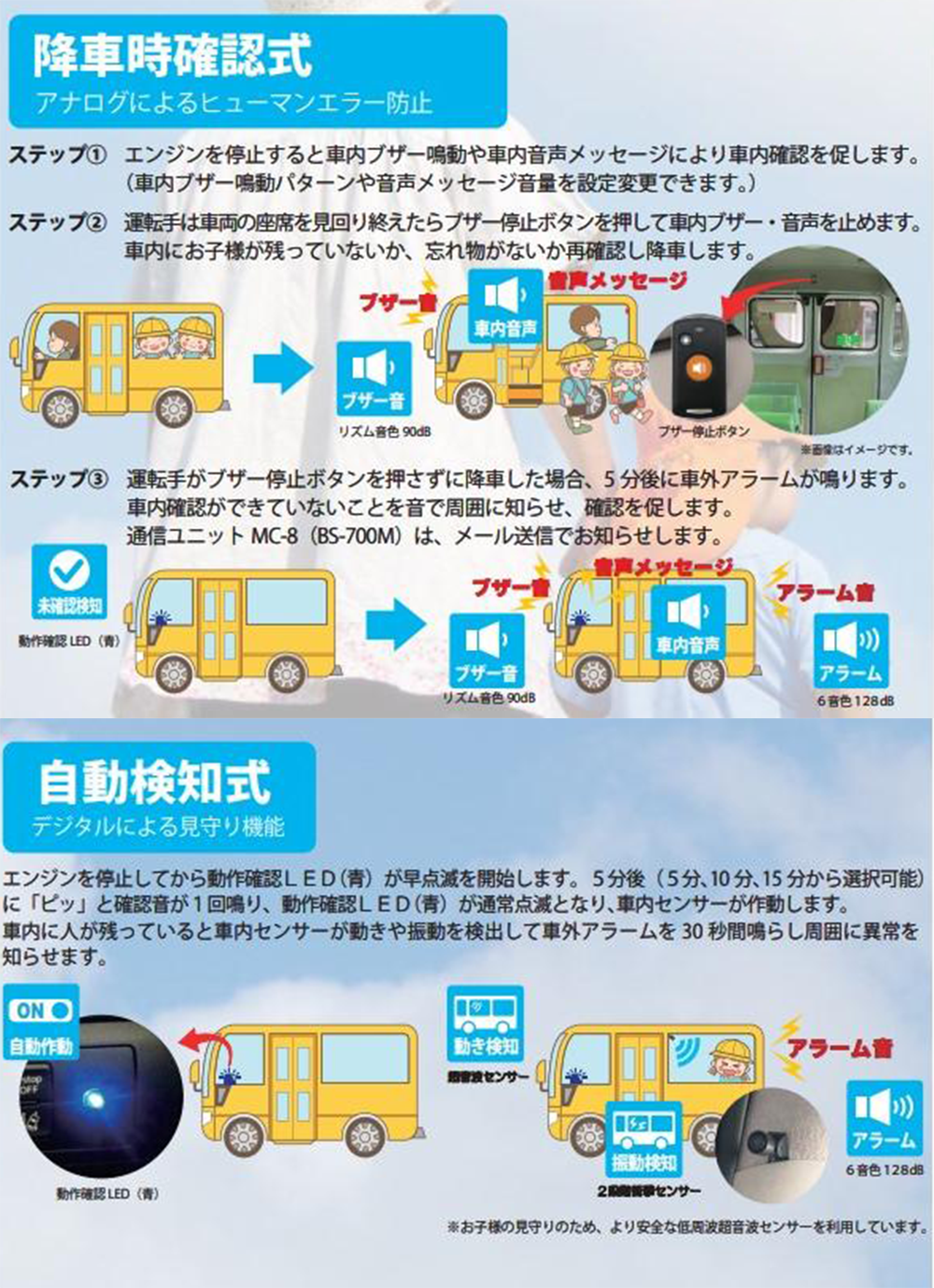『ライフ』の児童デイサービス送迎車は、『車内置き去り防止安全装置 BS-700S』を全ての車両に搭載しております。